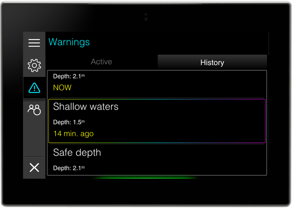 Veiligheid & boordstatus: dieptemeting, ondiepte-alarm, batterijstatus, trim/roerhoek, alarmsignalen voor kritieke waarden.