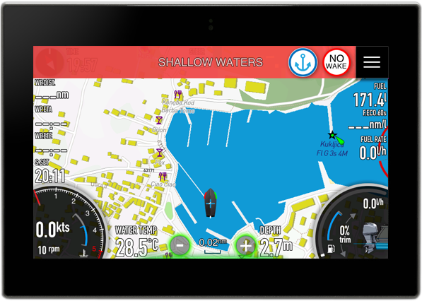 • Anchor-modus & No-Wake zone waarschuwingen — definieer een anker-radius; verlaat de boot deze radius, dan krijg je een alarm. Daarnaast waarschuwt het systeem wanneer je te dicht bij de kust of in een “no wake zone” vaart.