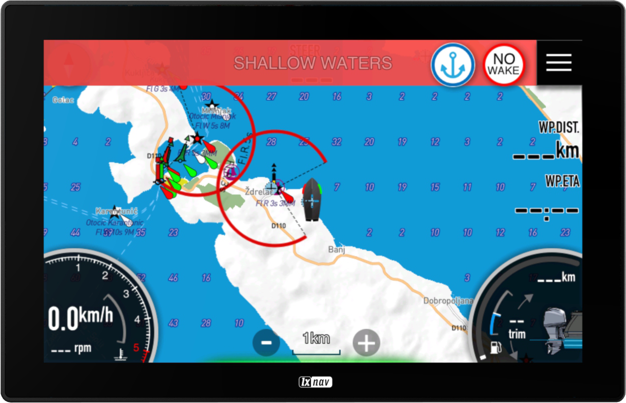 Diepte- & veiligheidsmonitoring met alarmsystemen — bij ondiepte of shallow water schakelt het scherm automatisch over naar dieptebeeld, met visueel én akoestisch alarm.