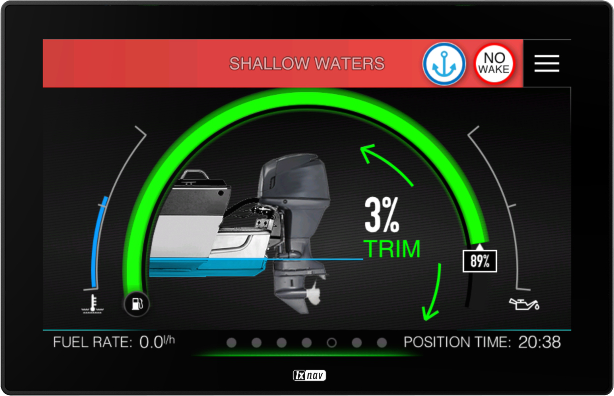 Veiligheid & boordstatus: diepte, ondiepte-alarm, trim tabs, roerhoek, batterijstatus, alarms.